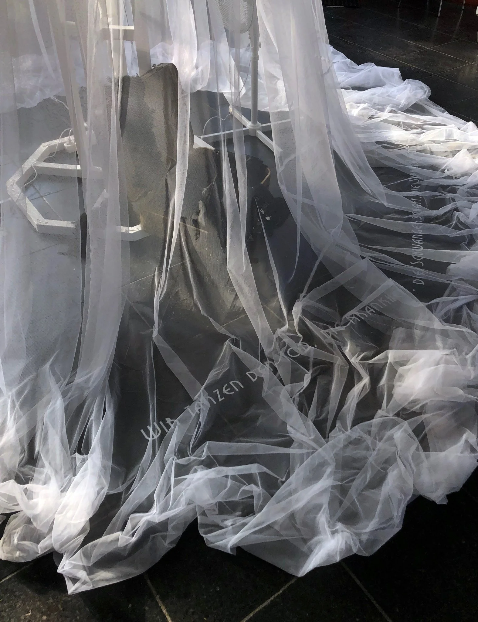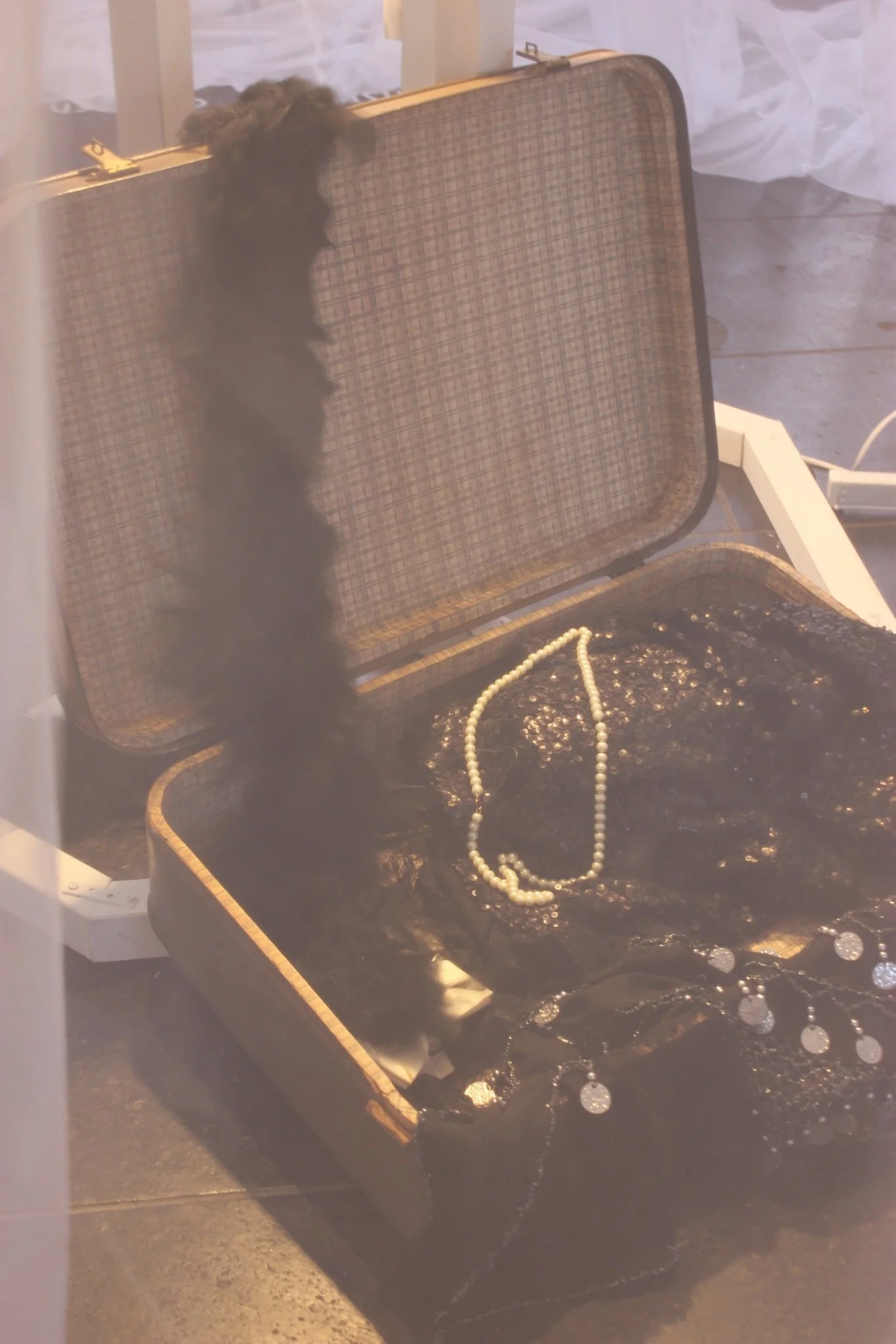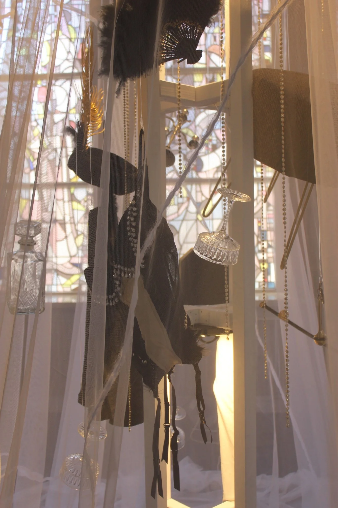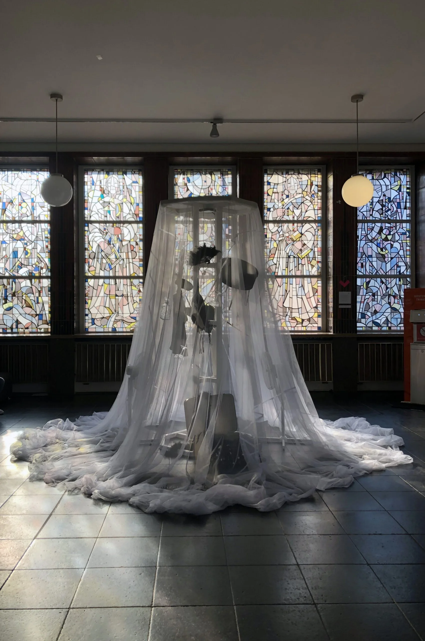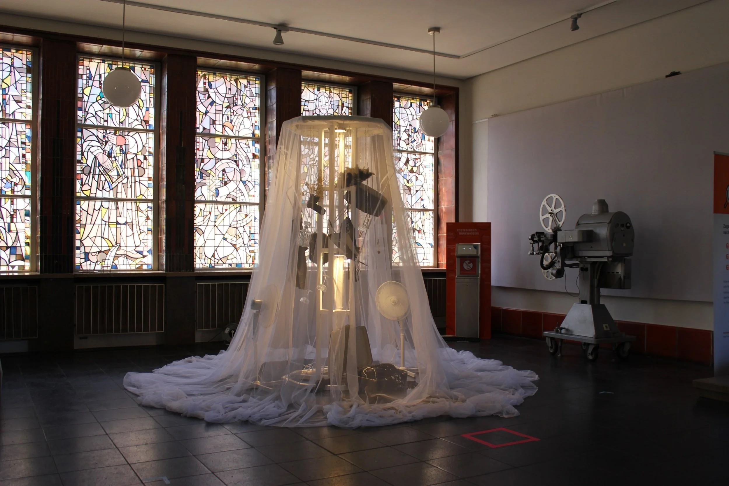 The installation Femme fatale of the 1920s and its elements is representative of the group of young female dancers who are not only to be associated with the seemingly glamorous show world of the 1920s. The permeable fabric in the installation conveys the mood of the women, which is intended to appear light and carefree on the outside, but is dominated by dreariness on the inside. A curtain that serves as protection to conceal the true face of one's personal state of mind. The elements of wind and sound support the contrast between what is shown and what is actually experienced.